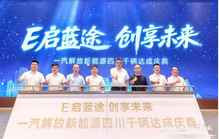 隨著音樂的響起,一汽解放領導與用戶代表、經銷商代表共同登臺啟動鎏金慶典,宣告“千輛”新征程正式啟航,預示著四川地區新能源運輸市場的美好未來。